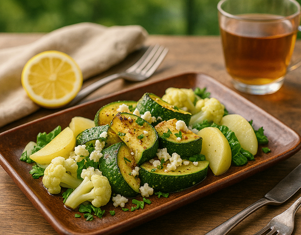 - Plate: Arrange zucchini on a platter, surround with light-colored vegetables, and sprinkle with feta and fresh herbs.
