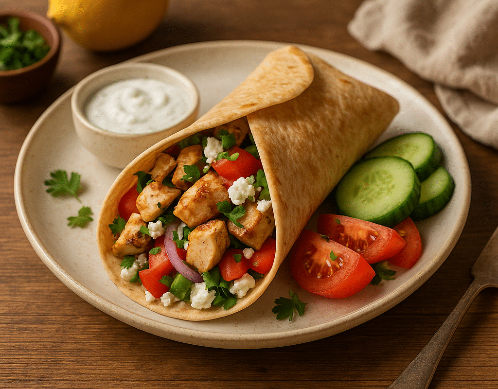 This Greek chicken wrap is bursting with juicy seasoned chicken, crisp vegetables, and creamy feta — all wrapped in a warm tortilla or pita. It’s quick, satisfying, and perfect for healthy lunches or fast dinners.